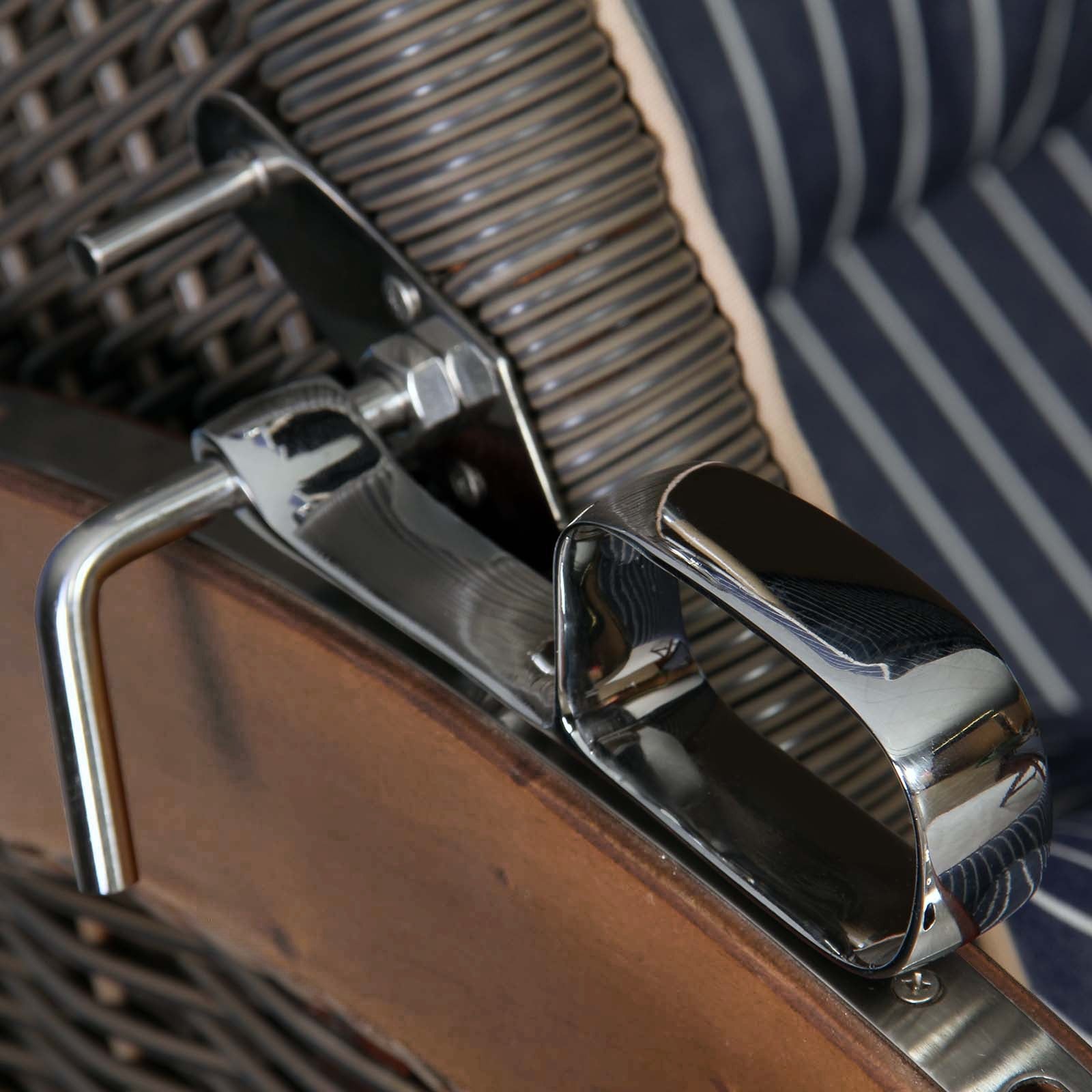 Langlebigkeit, die Sie spüren können. Die hochwertigen Edelstahlbeschläge sorgen für maximale Stabilität und Witterungsbeständigkeit – damit Ihr Strandkorb auch nach Jahren noch aussieht wie am ersten Tag.
