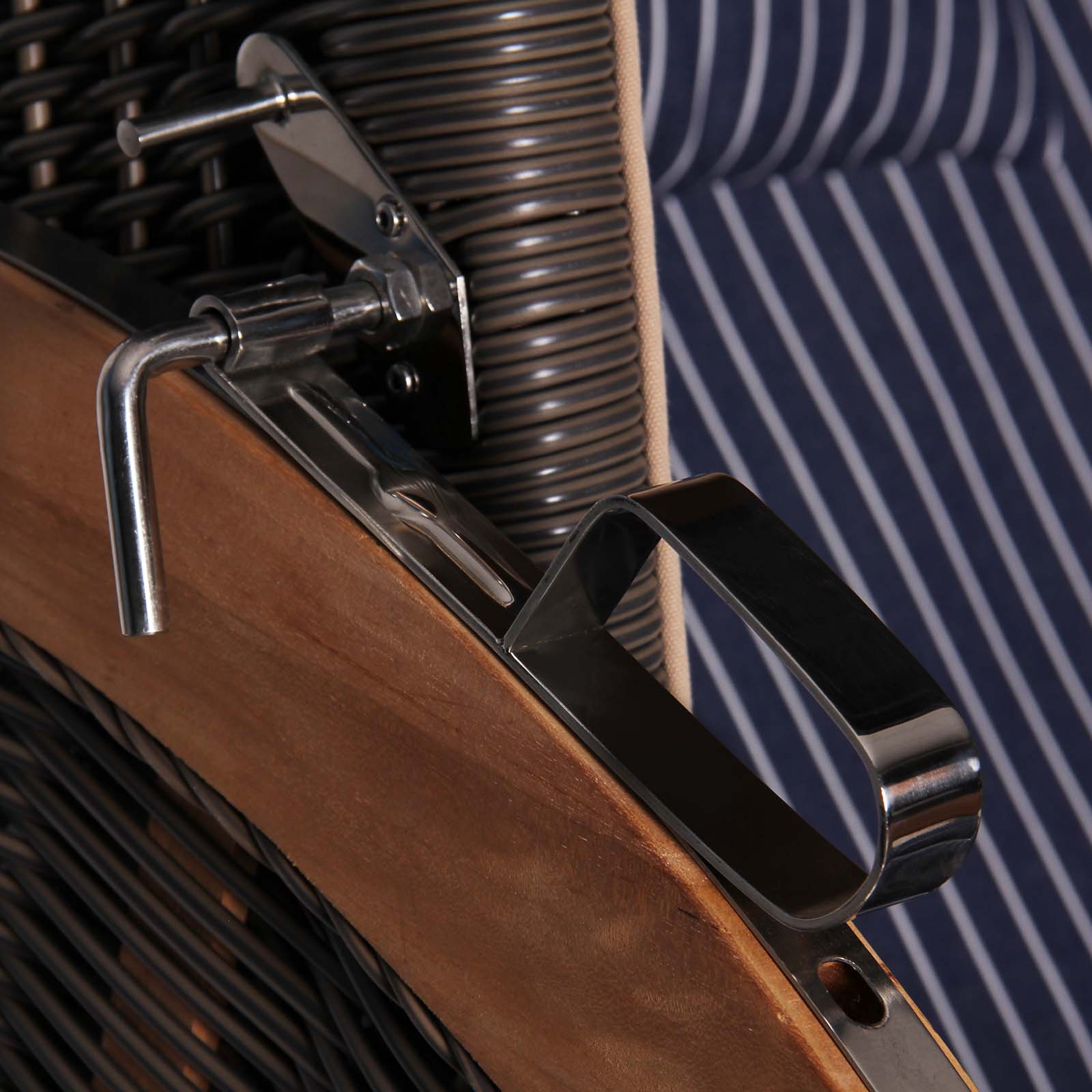 Langlebigkeit, die Sie spüren können. Die hochwertigen Edelstahlbeschläge sorgen für maximale Stabilität und Witterungsbeständigkeit – damit Ihr Strandkorb auch nach Jahren noch aussieht wie am ersten Tag.